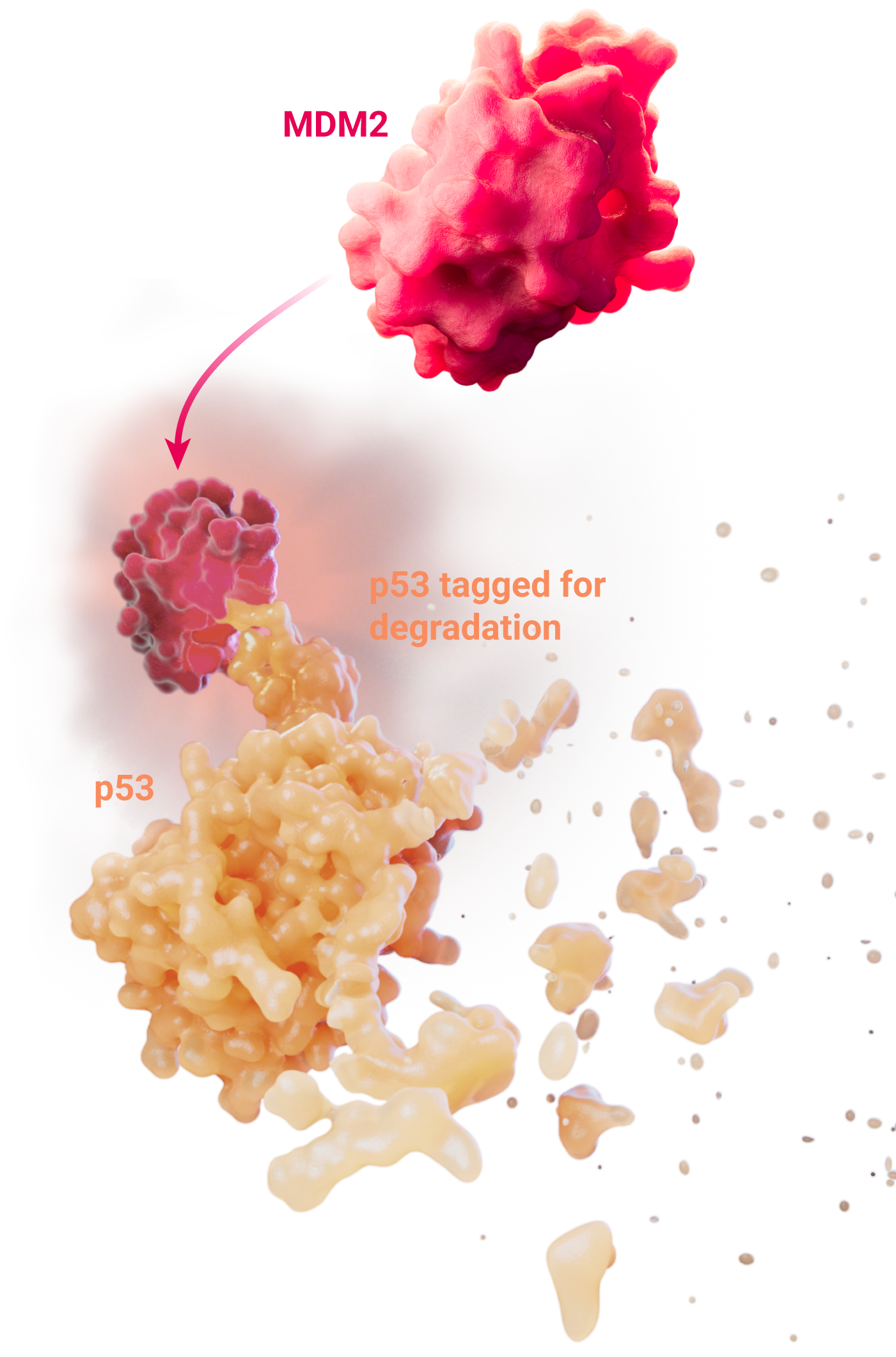 In healthy cells, activated MDM2 maintains p53 at very low levels. In cancer, however, malignant cells resist activated p53 cell killing by mutating p53 or abnormally elevating MDM2 levels, resulting in unchecked cancer cell proliferation.1,2